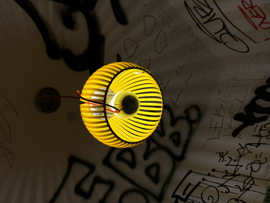 - "The image depicts an illuminated yellow, spherical light fixture suspended from an off-white ceiling" by FM-nKrUC2, licensed under CC BY 4.0