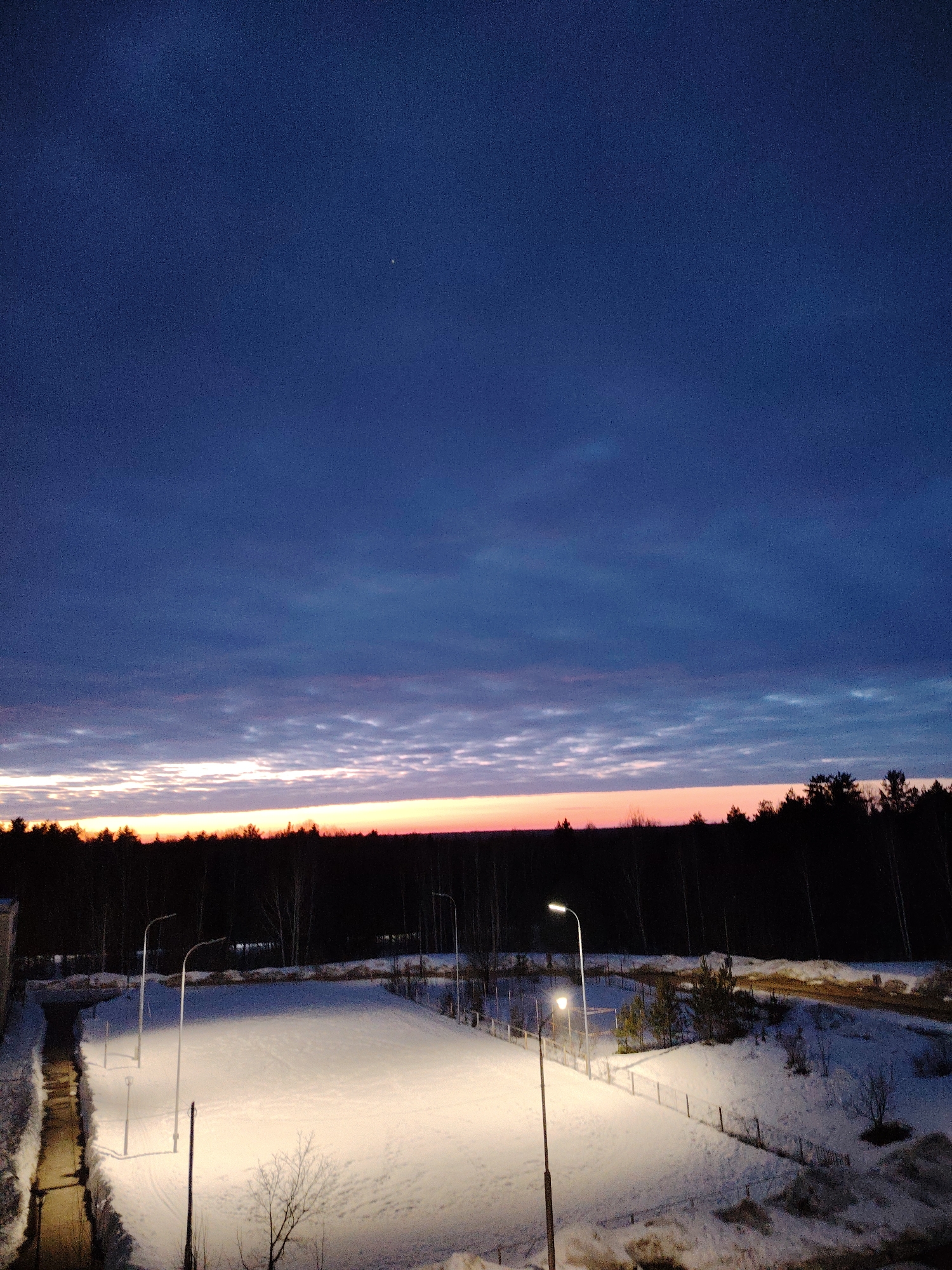 An overhead view captures a winter twilight scene in Марковский, Russia. The sky transitions from a deep, dark blue at the zenith to a vibrant band of orange, pink, and white hues along the western horizon, indicative of either sunset or sunrise. Stratified clouds are present, with some low-lying formations illuminated by the horizon light. A single luminous celestial body, likely a star or planet, is visible in the upper right quadrant of the sky. The horizon is dominated by a dark, dense forest, predominantly coniferous trees, silhouetted against the colorful sky. Below the forest, a snow-covered landscape unfolds. In the midground, a large, rectangular, snow-covered field, possibly a sports ground, is illuminated by several operational streetlights. Six tall lampposts with bright white luminaires are clearly visible, casting long shadows across the pristine snow. To the left of this field, a cleared, partially snow-covered paved pathway is visible, lit by several shorter, evenly spaced lampposts. To the right of the central snow field, the terrain rises slightly, revealing a snow-dusted embankment with sparse, bare deciduous trees and bushes. A wire fence delineates a portion of this area, and a dirt track or road is discernible. A small, bare tree stands centrally in the foreground snow. No human figures or active vehicles are present in the scene. A dark, angular structure, possibly a building, is partially visible on the far left edge of the image.