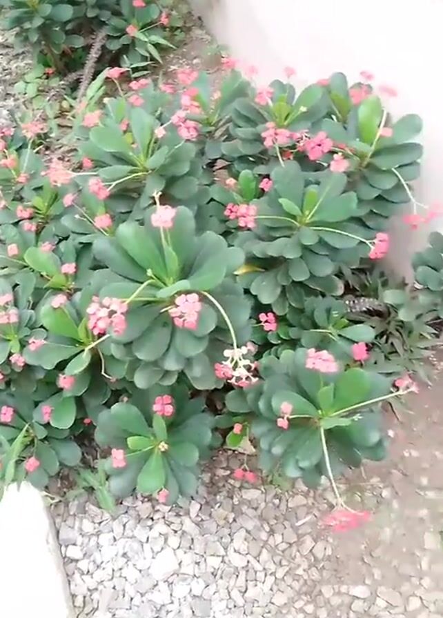 patch of "Crown of Thorns" plants with red flowers. The plants are bordered by a sidewalk and a wall, with gravel filling the space around the plants. A person walks past in the background. The camera pans slightly to follow the line of plants.
