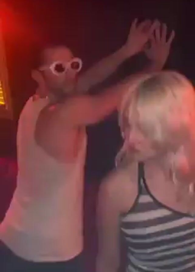 two people in a dimly lit environment, possibly a nightclub, with red lighting and a patterned wall in the background. A man with short, dark hair and a slight beard is wearing a white tank top, dark pants, and white, oval sunglasses. He's moving and dancing with one arm raised. Next to him is a woman with blonde hair wearing a black and white striped top. She appears to be relatively still. There is music playing.
