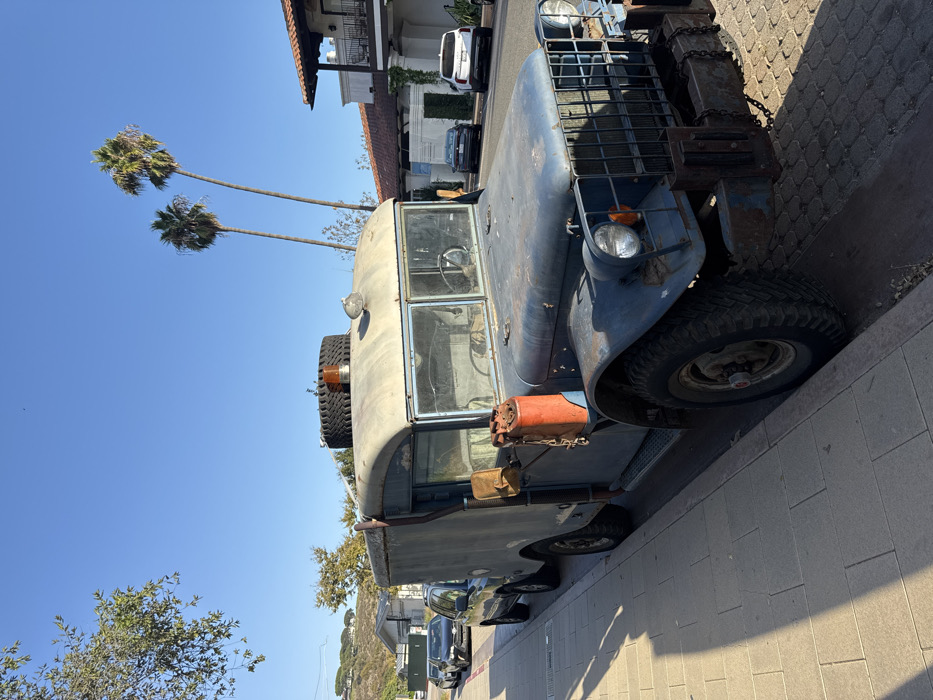 The image captures a static daytime street scene in Malibu, United States, under a clear blue sky. A heavily weathered, faded blue-gray vintage utility truck, consistent with a military-style vehicle, is parked curbside on the right, facing towards the viewer's left. The truck displays extensive surface rust and paint degradation. It features a box-style utility body, a split windshield, round headlights, an amber turn signal, and a square grille with a robust, rusted front bumper incorporating chain links. An orange, corroded jerry can is suspended by a chain from the driver's side, positioned below an external, vertical exhaust pipe. A spare tire and an amber rotating beacon light are mounted on the cab roof. The vehicle's large, aggressive-tread tires rest on a light-colored sidewalk composed of rectangular pavers, which is partially shadowed. Behind the utility truck, a dark SUV and a dark sedan are parked along the same curb. Across the street, a two-story building exhibiting Mediterranean-style architecture, characterized by terra cotta roof tiles, stucco walls, and a visible balcony with a wrought-iron railing, is present. In front of this building, a dark sedan and a white SUV are parked. Two tall palm trees are prominent against the bright sky on the right side of the frame. A green, tree-lined hillside with distant residential structures is visible on the left side of the background. No people or dynamic actions are depicted in the scene.