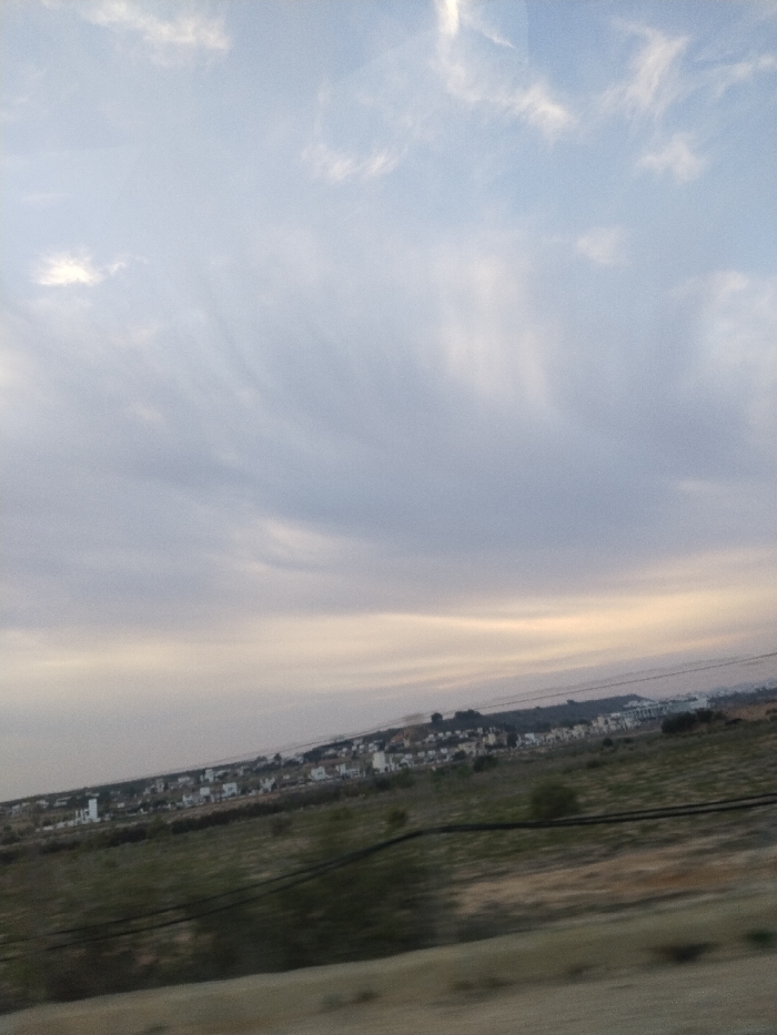 A landscape view displays a rural hillside topped with a small collection of buildings under an expansive sky. The sky is filled with soft, layered clouds, exhibiting a mix of gray and white hues with a hint of yellow light near the horizon. The hill itself is covered in grassy vegetation and scattered shrubs. The overall scene suggests a peaceful, overcast day in a countryside setting. The horizon line is somewhat obscured by the clouds and the slight incline of the hill.