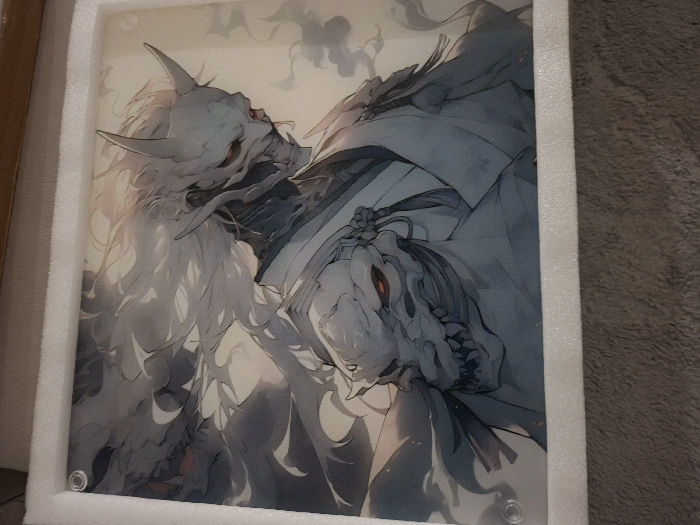 An artistic print featuring a stylized, horned figure is depicted within white foam packaging