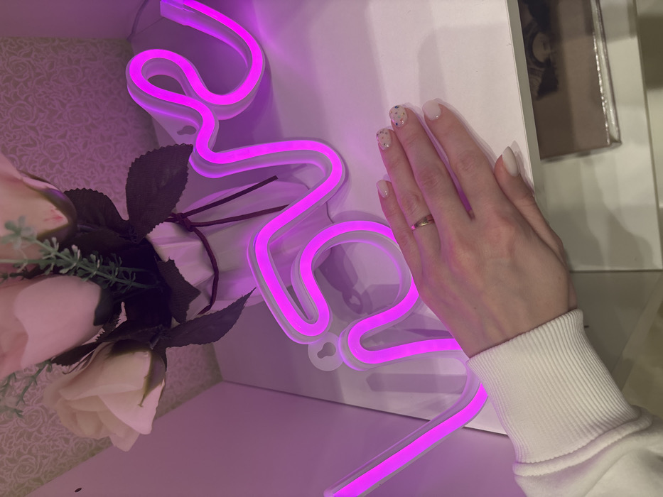 A hand rests on a white shelf, near a vibrant pink neon sign spelling "love". The hand features a simple gold ring and delicate nail art. To the left, a bouquet of soft pink roses adds a touch of romance. The scene is bathed in a soft, purple-pink light, creating a warm and inviting atmosphere. The background is a mix of white surfaces and a hint of floral wallpaper.