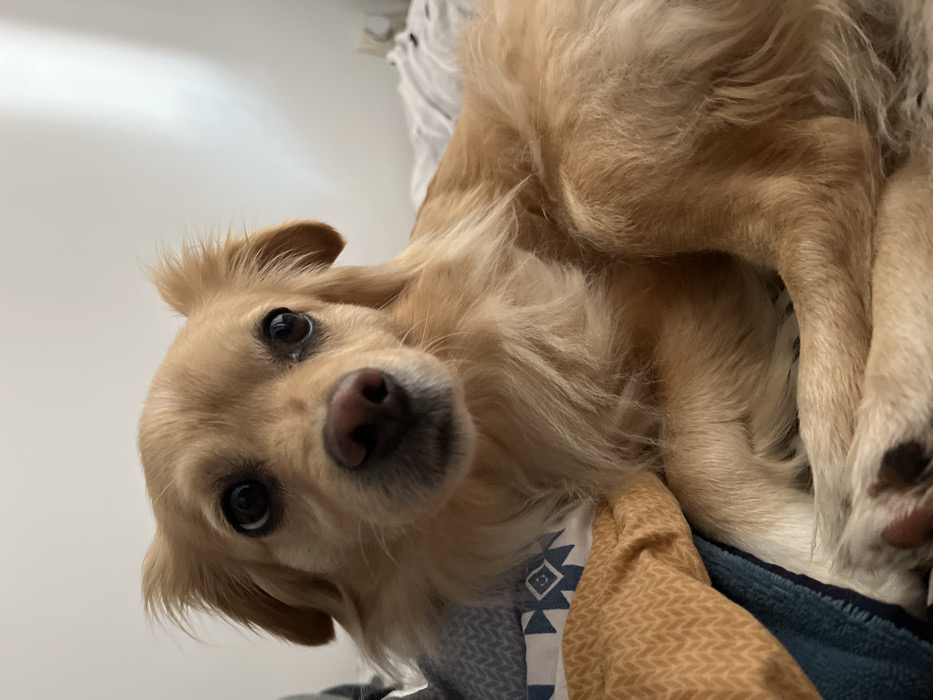 An individual light-brown colored domestic canine, with distinct dark, round eyes and a prominent black nose, is depicted in a close-up, chest-up view. The animal possesses long, wavy fur, particularly noticeable around its ears and chest. Its ears are partially erect and feathered. The canine is positioned indoors, resting on a bed or similar soft furnishing. Visible bedding includes a blue fabric with a white geometric pattern and a textured gold-colored fabric with a chevron-like design. The background consists of a plain, light-colored wall with ambient lighting. No other individuals or significant objects are visible. The scene is located in the city of Varna, Bulgaria.