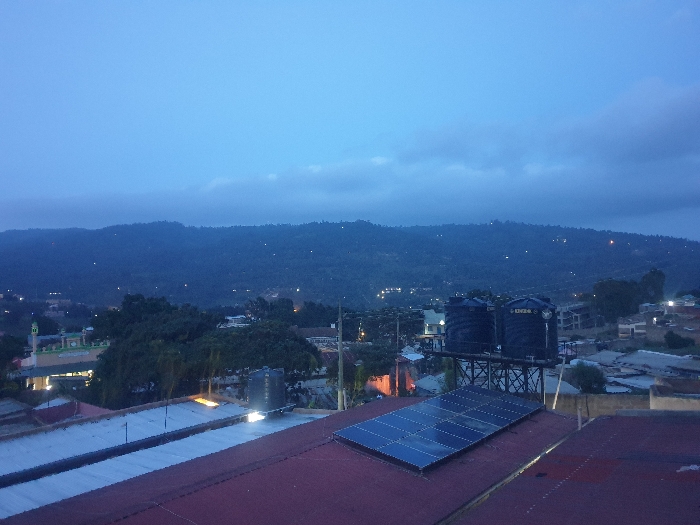 This image presents an elevated panoramic view of Machakos, Kenya, at twilight. The scene is dominated by a clear sky, transitioning from dark blue at the zenith to a lighter, cloud-streaked blue-grey nearer the horizon, indicating either dawn or dusk. In the foreground, a prominent red corrugated metal roof slopes from left to right, featuring a rectangular array of multiple dark blue photovoltaic solar panels mounted on its surface. To the right of this roof, slightly further back, two large, cylindrical black plastic water tanks are visible, elevated on a dark metal truss structure above another building. The midground displays a densely populated urban area with a variety of single and multi-story buildings, characterized by flat and corrugated roofs of differing colors, including grey, red, and light blue. Scattered lights from buildings and possibly streetlights illuminate parts of the urban sprawl. Notably, a light green building with a dome and arched windows, consistent with mosque architecture, is visible towards the left side of the midground, with its interior lights casting a glow. Clusters of dark green trees are interspersed among the structures, partially obscuring some buildings. In the background, a range of dark, undulating hills or mountains covered in dense vegetation stretches across the horizon. Numerous small, bright pinpricks of light are visible across these distant hills, suggesting additional settlements or infrastructure beyond the immediate urban area. No specific individuals, active interactions, or distinct actions are discernible within the frame.