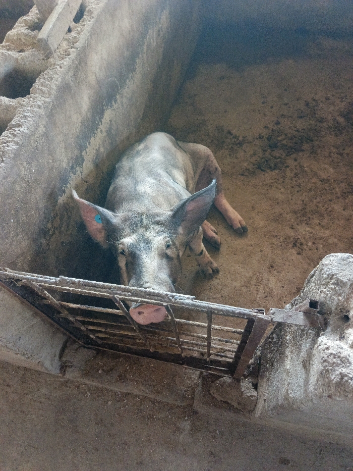 - "A single, lean pig is observed lying on its left side within a concrete animal pen" by FM-uR1S93, licensed under CC BY 4.0