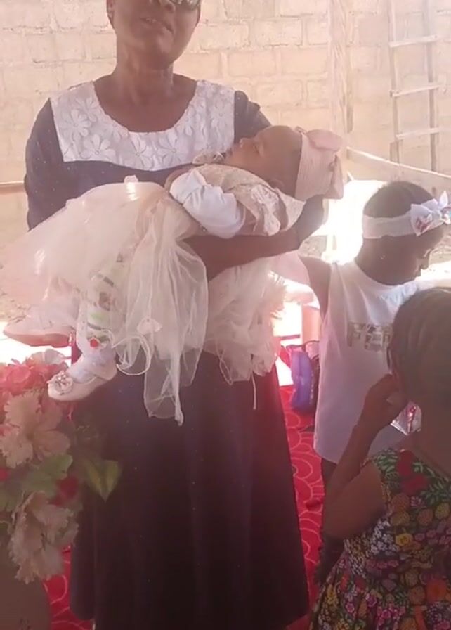 A woman stands holding a baby in a white dress and a pink headband. The woman is wearing glasses, a red head covering, a black and white top and a black skirt. Three children stand next to her looking at the baby. One child is wearing a white top and a white headband, and the other child is wearing a multicolored floral dress. The third child's head is only partially visible. The woman appears to be speaking. There is a floral arrangement to the left of the woman. The scene appears to be indoors under a roof. The walls are concrete blocks. There is a red rug on the floor.