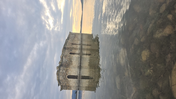 A stone structure, identified as the partially submerged Church of St