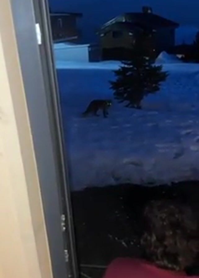 red fox standing in the snow in a residential area at night. The fox's eyes glow brightly in the dim light. The fox is facing the camera and appears to be looking directly at the person filming. The video is taken from inside a house, looking out through a slightly open door. A person is visible in the bottom right corner of the frame. There are houses and a small tree visible in the background. The ground is covered in snow. The sky is dark.