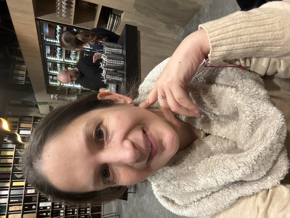 A woman smiles into the camera, wearing a fuzzy beige wrap over a sweater. On her hand, there's a ring. Behind her, a man with a bald head stands with a woman in front of a cooler containing wine bottles, near metal cylinders. There's a shelf full of wine bottles on the left and other shelves overhead. The scene suggests a restaurant or bar setting.