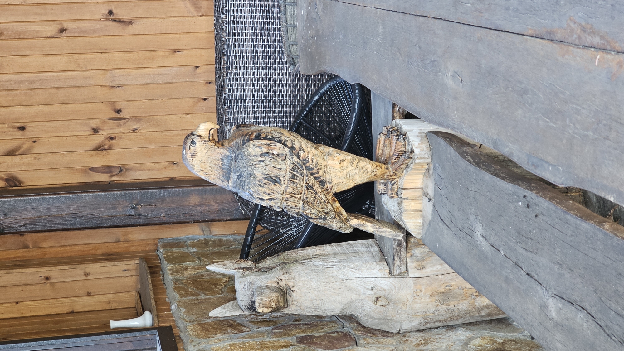 A wooden sculpture of a bird, possibly an eagle or hawk, is prominently displayed