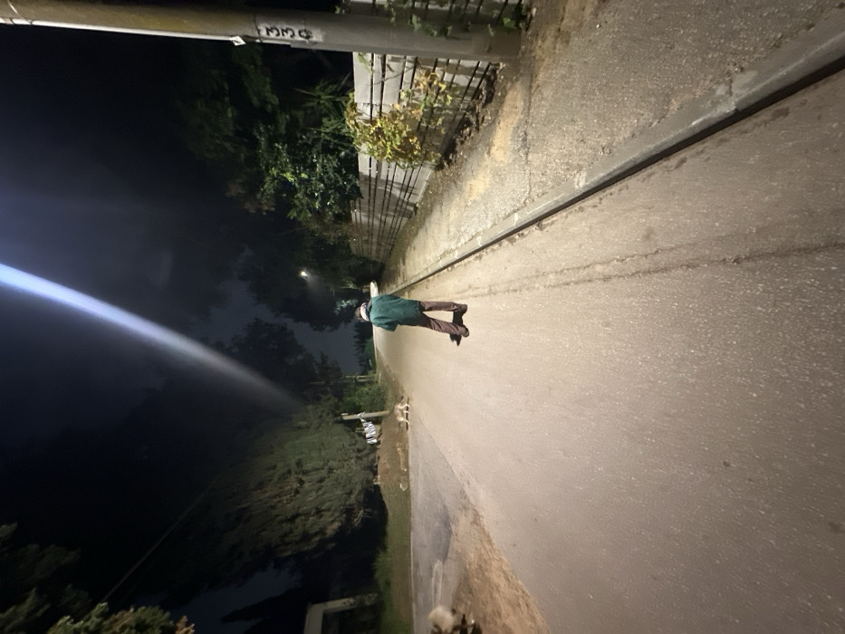 A man stands on a deserted road at night. He wears a light-colored helmet, a green jacket, and brown pants. The road stretches into the distance, flanked by trees and a fence on one side. A bright light shines from the left, illuminating the dark sky and trees. Two cats are near the edge of the road on the right. The scene is a somewhat disorienting angle.