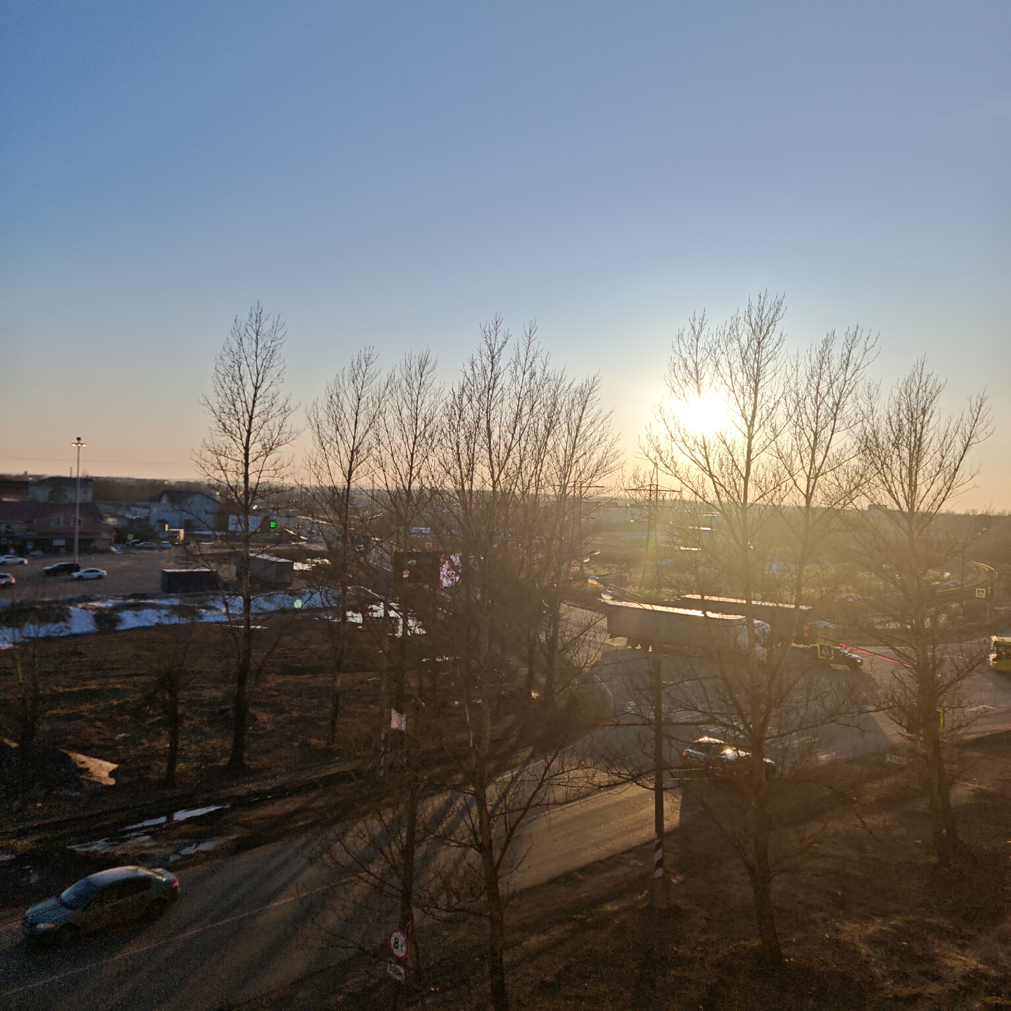 The scene depicts an urban landscape within Rostov Veliky, Russia, under a clear, pale blue sky transitioning to a warmer hue near the horizon, illuminated by a low-angle sun positioned in the right-center. The time of day is either late afternoon/early evening or early morning, characterized by long shadows and intense lens flare. The foreground and midground are densely populated with bare deciduous trees, their skeletal branches silhouetted against the bright sky. The ground consists of dark earth, patches of melting snow, and standing water. A dark-colored sedan travels from left to right on a paved road in the lower-left quadrant. In the midground, a road junction is visible. A large, dark semi-truck is positioned on the right side of this junction, facing right. A lighter-colored car, possibly a white sedan, is stationary on the road near the truck. A yellow vehicle, likely a bus or commercial van, is partially visible on the far right. A distinct vehicle, possibly an emergency or utility vehicle, is stopped at the junction with active red flashing lights, and a red hose-like object extends from it onto the pavement, indicative of road work or an incident. In the background, on the left, several low-rise buildings with reddish roofs are visible, accompanied by a parking area containing multiple parked cars. A tall street light pole with multiple fixtures stands on the far left. A circular white road sign with a red border, displaying the number "8" and "300m" below it, is visible in the lower-left, indicating a localized speed restriction. A yellow pedestrian crossing sign is also discernible on the right side of the junction. Utility poles and power lines are present in the distant background. No individuals are clearly identifiable. The environment suggests a transitional season, likely late winter or early spring.