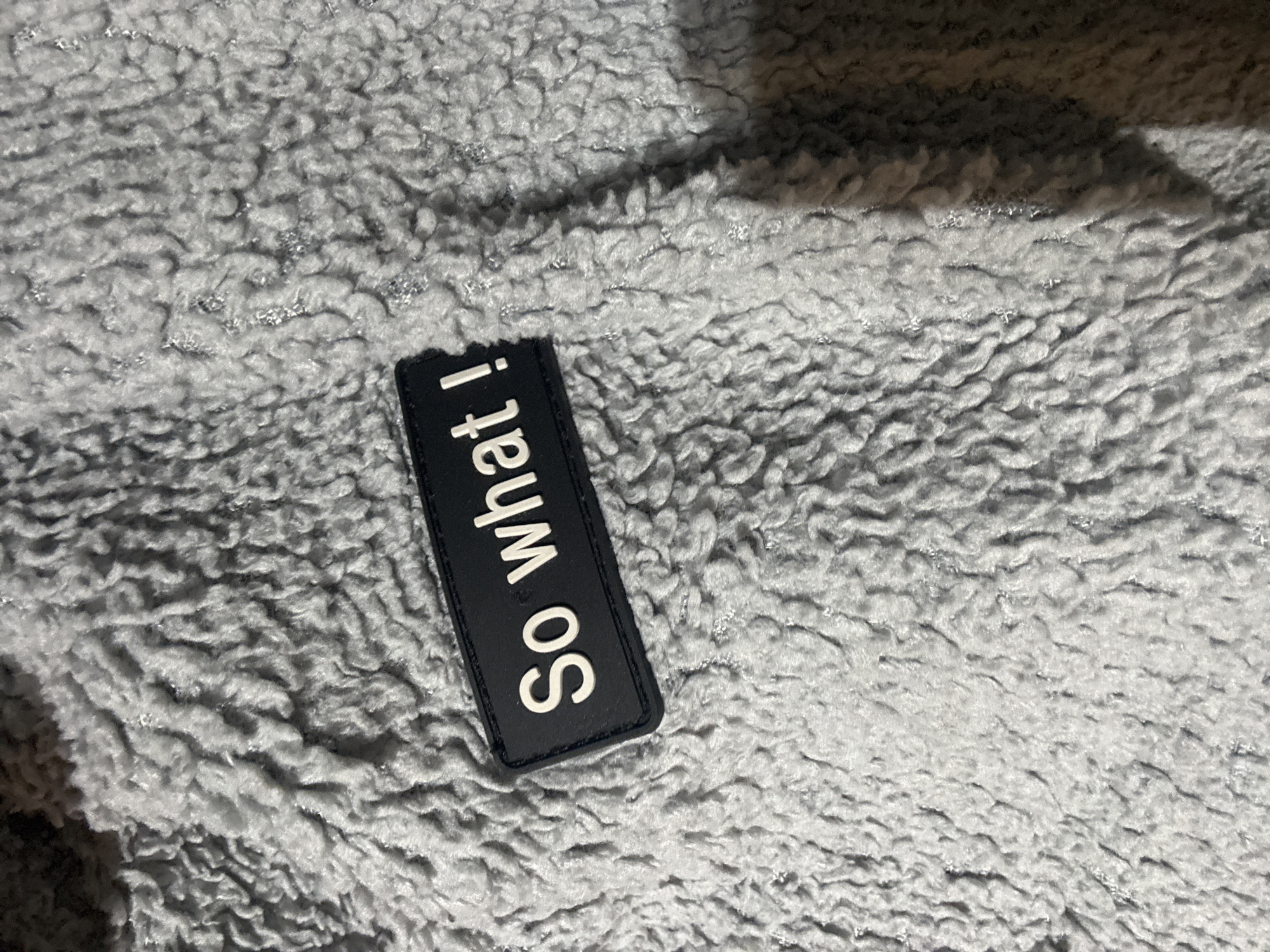 close-up of a gray, fluffy, textured fabric with a black rectangular patch sewn onto it. The patch has the text "So what!" printed in white. The lighting is soft, creating shadows that enhance the texture of the fabric. No people or specific environmental details are visible. There is no information about location of Armagh, United Kingdom.