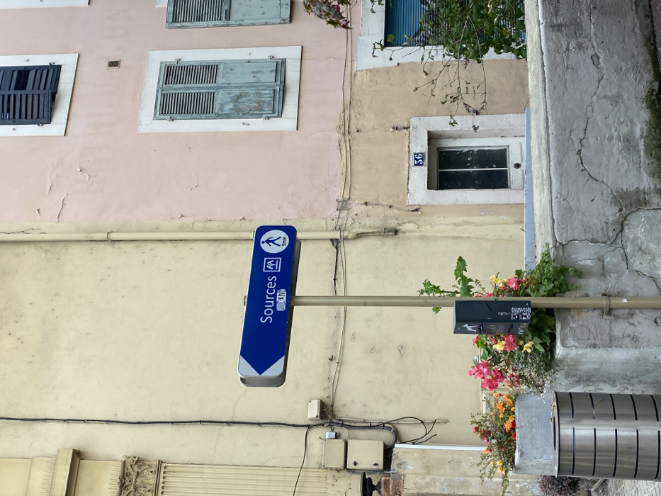This image captures a street scene in Évian-les-Bains, France, focusing on architectural elements, signage, and urban fixtures. On the left, a building features a light beige stucco facade, with a fluted classical pilaster visible at the far left edge. A black utility conduit runs vertically along this wall, and two beige electrical junction boxes are mounted lower on the wall. Adjacent to this, on the right, stands a building with a faded pink stucco facade exhibiting areas of peeling paint. This building features three visible windows: the uppermost has dark blue louvered shutters, partially open. Below it, two windows are equipped with closed, weathered light blue louvered shutters. At ground level, a smaller window or doorway with white trim is present, marked with the number "36" in blue above it. Centrally positioned, a blue rectangular directional sign is mounted on a slender metal pole. The sign displays a white left-pointing arrow, the word "Sources" in white text, a white wheelchair accessibility symbol, and a white pedestrian symbol with "5 min" indicating a five-minute walk. Directly below this sign on the same pole is a black rectangular utility box, adorned with white sticker remnants or graffiti. In the foreground, a low, cracked concrete wall or planter runs horizontally across the scene. Two concrete planters filled with vibrant red, pink, orange, and yellow flowering plants, along with green foliage, are situated near the base of the sign pole. To the lower left, a cylindrical stainless steel trash receptacle with horizontal ribbed detailing is partially visible. Additional green foliage extends into the frame from the right side, partially obscuring the lower portion of the pink building. No individuals are visible in the scene.