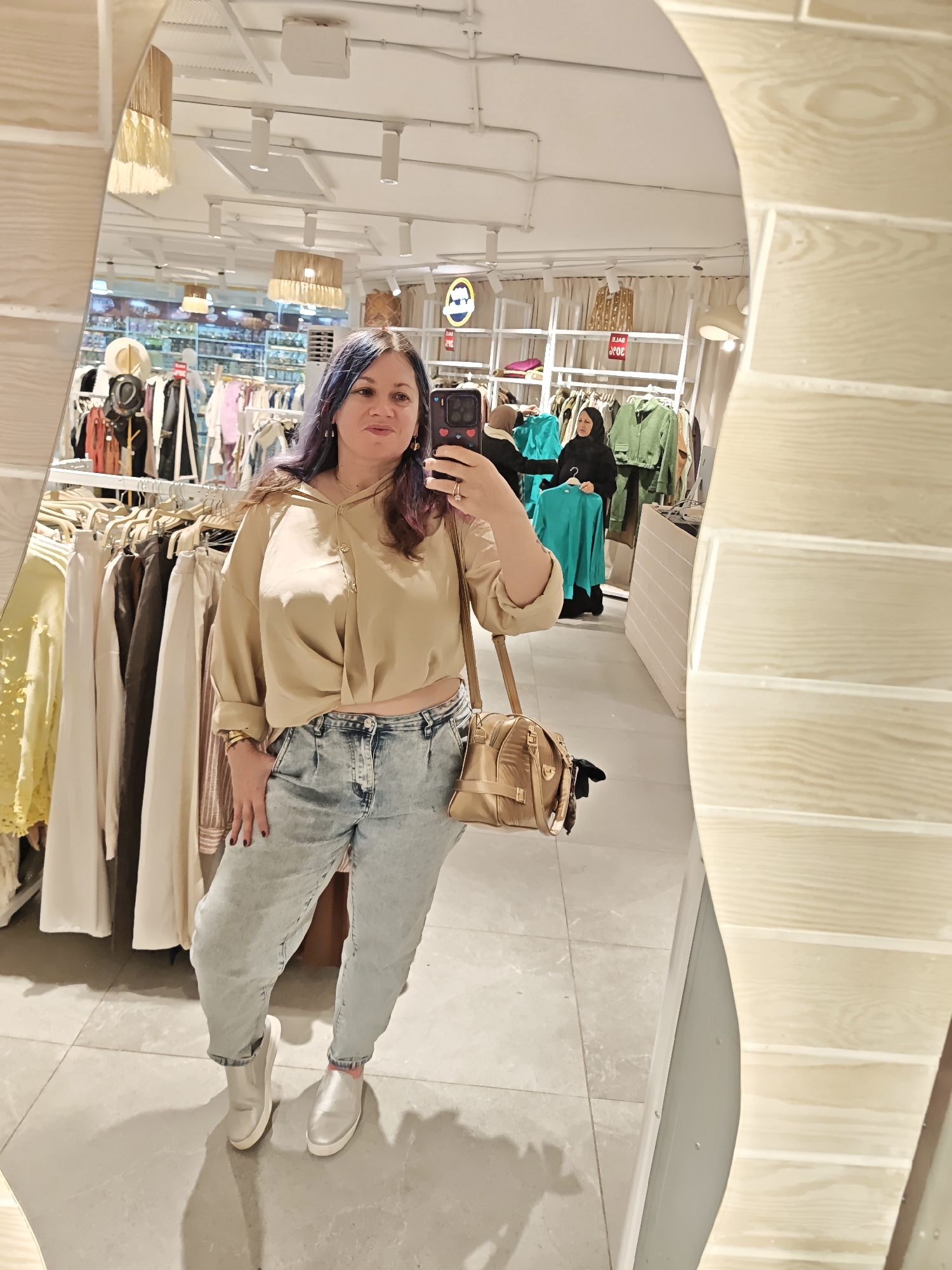 The image displays a mirror selfie taken by a woman within a retail clothing store located in Al Hadaba, Egypt. The primary subject, reflected in the large mirror, is a woman with dark hair featuring purple and blue highlights. She is wearing a cropped, long-sleeved, beige button-up shirt knotted at the front, light-wash pleated denim jeans, and silver slip-on sneakers. Accessories include a gold-colored necklace, gold hoop earrings, a gold bracelet on her left wrist, and a small, structured, light tan shoulder bag with a short strap. Her left hand holds a dark-colored smartphone with a heart-patterned case, capturing the reflection, while her right hand rests in her jean pocket. The background, also visible in the mirror's reflection, depicts the interior of the clothing store. Numerous clothing racks hold various garments, including dresses, shirts, and jackets, in colors such as white, beige, yellow, brown, green, and black. Two other women are present in the background: one wears a black abaya and hijab, holding a bright turquoise top on a hanger, and another, partially visible, wears a beige hijab. The store features white shelving units, overhead track lighting, and decorative pendant lamps with fringed shades. Signage includes a yellow circular emblem with a character graphic and a red mirrored sign indicating "30%" for a discount. The floor is covered with light grey square tiles. The mirror itself has a light wood-grain frame along its right and top edges.
