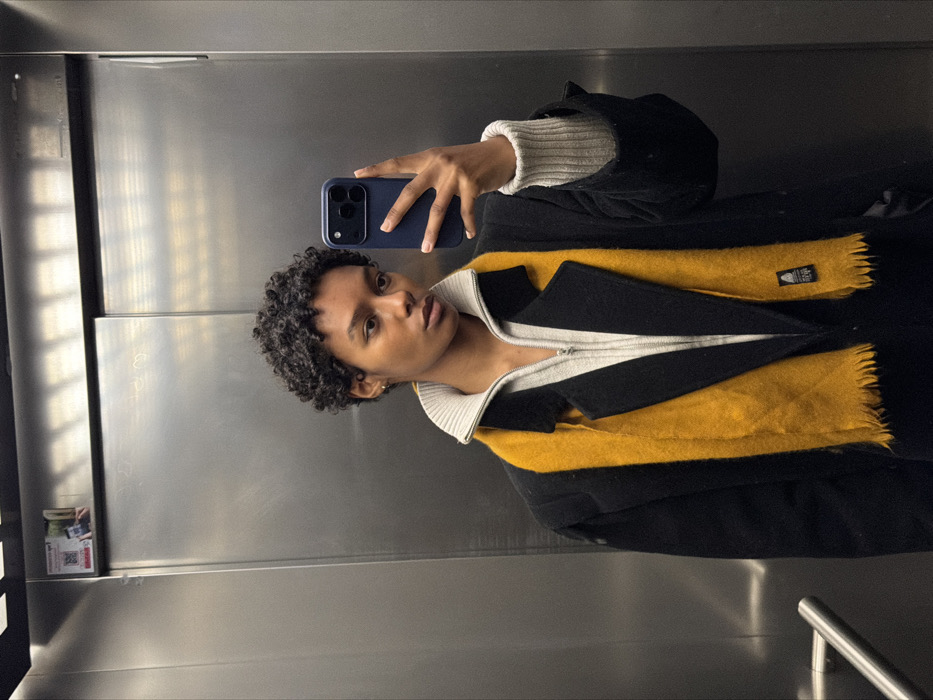 An individual is depicted taking a mirror selfie inside an elevator in Pantin, France. The subject, a young person with short, dark, curly hair and medium-dark skin, is facing forward with a neutral expression. They are wearing a light grey ribbed quarter-zip sweater under a dark, possibly black, overcoat with wide lapels. A prominent bright yellow, fringed scarf with a small label (possibly featuring Asian characters) is draped around their neck. A small gold hoop earring is visible in the subject's left ear. The subject holds a dark blue smartphone with a dark blue case in their right hand, positioned to capture their reflection. The elevator interior features reflective metallic walls, likely stainless steel, which show reflections of overhead lighting. A metallic handrail is partially visible in the lower left corner. A white sticker with a QR code and an image is affixed to the upper left section of the elevator wall.