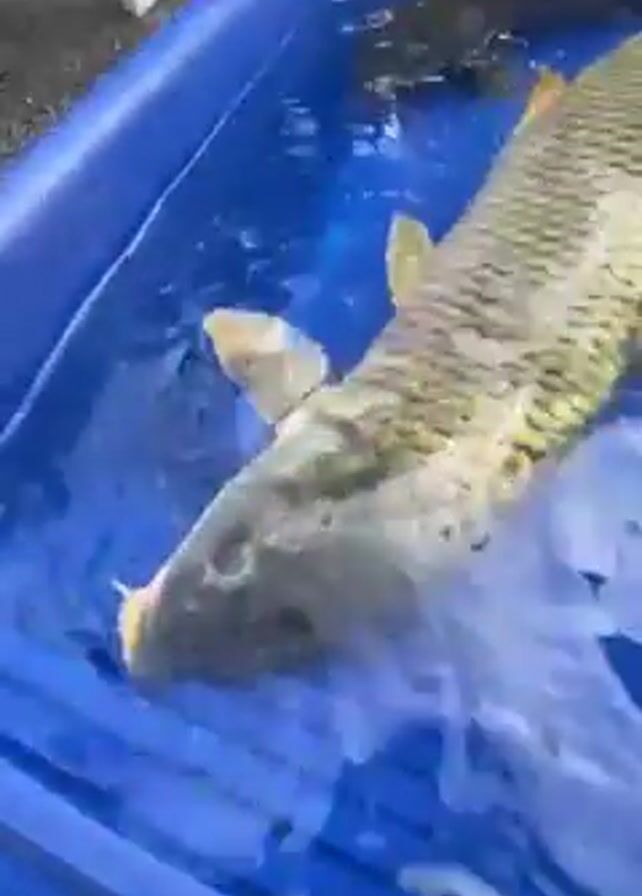 two large fish swimming in a blue plastic container filled with water. The fish are gray with a rough, scaled texture. The water is clear and slightly agitated by the fish's movement. A hand reaches into the container and points to one of the fish. The container is placed outdoors on a paved surface, with a leg of a white table visible in the background. The video appears to be taken at a slightly high angle, focusing on the fish and the container.