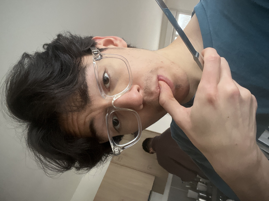 The scene is an interior setting, identified as Villeneuve-d'Ascq, France. A male individual occupies the foreground, looking directly at the camera. He has dark, wavy hair, a light complexion, and a sparse mustache, wearing clear, rectangular glasses and a teal t-shirt. His right index finger is pressed against his lower lip. A silver-colored utensil, possibly a knife or spoon, is held in his left hand, angled upwards on the right side of the frame. In the left background, a second male individual is partially visible from behind, dressed in a brown long-sleeved shirt, standing in what appears to be a kitchen area. This area contains a metallic counter surface with visible metallic items, and light-colored wooden upper cabinets. The environment is uniformly lit.