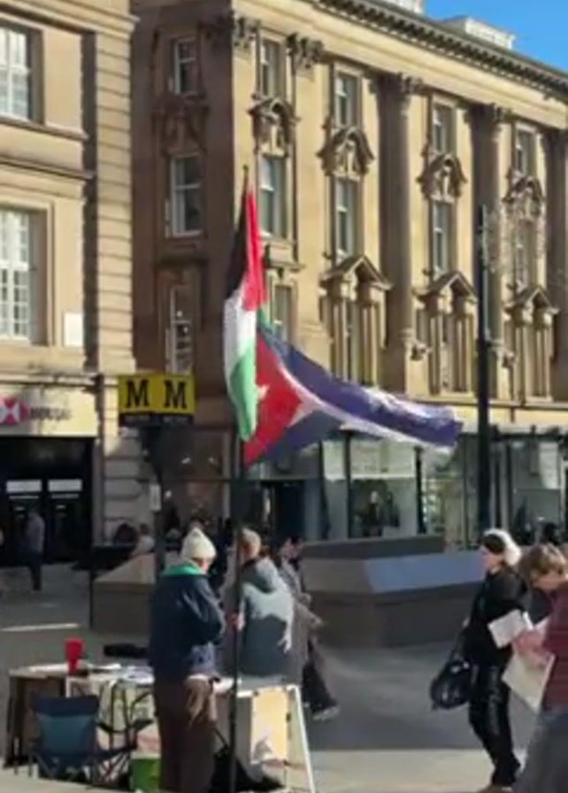 In an outdoor urban setting under a clear, bright blue sky, a group of people stand around a table with a folding chair and pamphlets, next to a flag mounted on a pole. The flag is composed of multiple flags layered on top of each other, and is flapping in the wind. The people are interacting with the table and the individuals standing around it. People walking past the table and flag are seen. Behind the group is a multi-storied building with a symmetrical facade and ornate architectural details. A HSBC sign is visible. A sign with two stacked “M”’s in yellow and black can be seen to the left of the flag. The location appears to be a city square or plaza, with paved ground and a raised concrete area.