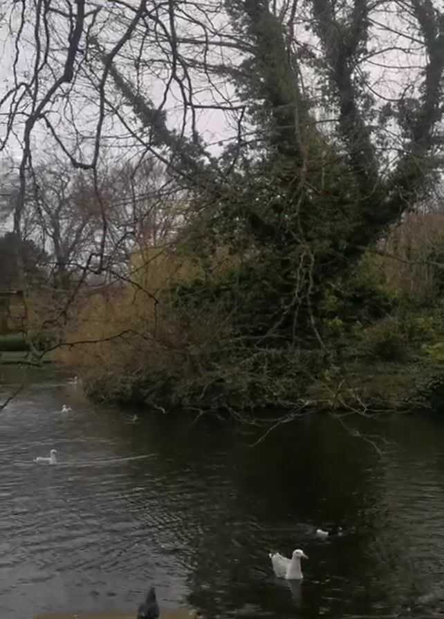 calm pond in a park on a cloudy day. Several white birds, possibly swans or gulls, are swimming in the water. On the edge of the pond, a gray pigeon stands on a concrete slab. The area around the pond is green with grass and foliage, and bare trees frame the scene. The overall atmosphere is tranquil.