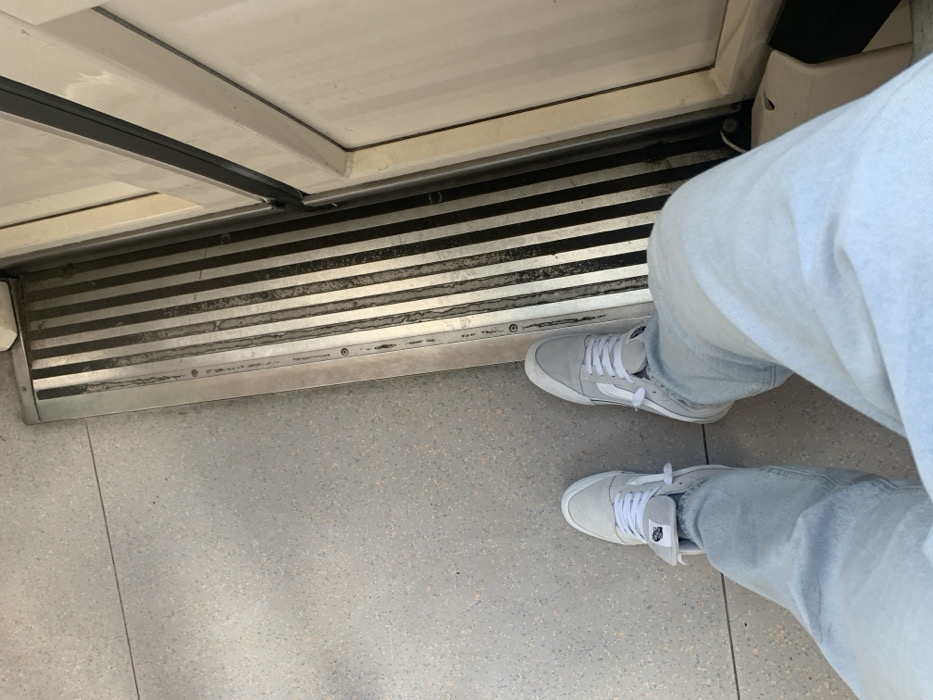 The image presents a downward-facing, first-person view of an individual's lower body within an indoor setting in Schiltigheim, France. The subject wears light-wash denim jeans and light grey high-top sneakers, featuring white laces, white soles, and a white side stripe. A black Vans logo patch is visible on the tongue of the left shoe. The footwear rests on a light grey, subtly speckled floor surface. To the right of the frame, a metallic threshold equipped with approximately ten parallel black anti-slip strips is visible; these strips display signs of wear and minor dirt accumulation. Directly adjacent to this threshold, the vertical edge of a light-colored, possibly off-white, panel or door with a dark rubber seal occupies the far right portion of the image. No other individuals or specific actions beyond standing are discernible.