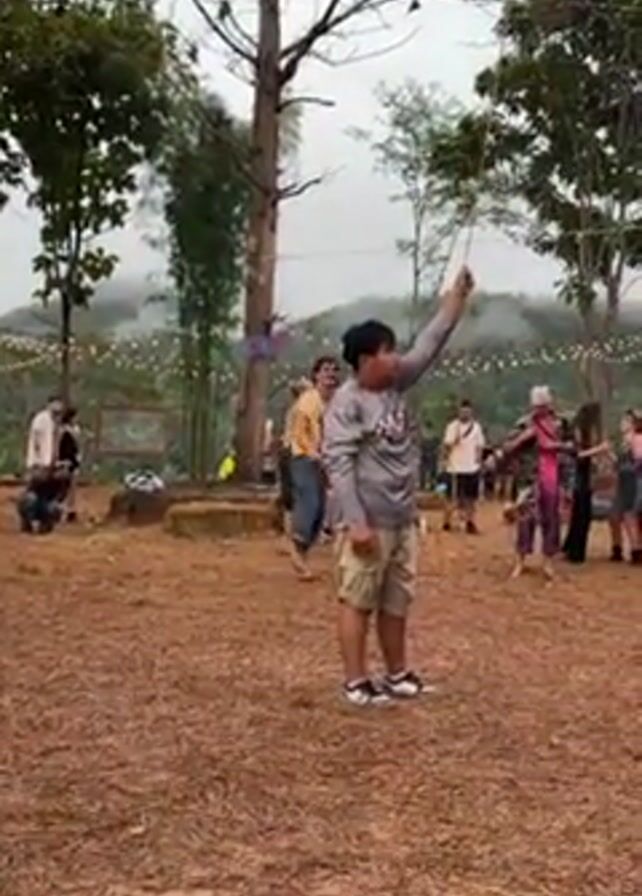 n outdoor gathering of people on an area covered in pine straw, with trees and what looks like a stage or setup in the background. A boy in a grey shirt and khaki shorts is standing near the center, holding a string connected to a birdhouse suspended in the air. A man with curly hair walks in front of the camera, briefly obscuring the view. Several people are standing and mingling in the background, some taking photos. The environment suggests a casual, festive atmosphere. There are lights strung between the trees. The terrain behind the crowd slopes up to a mountain covered with fog.