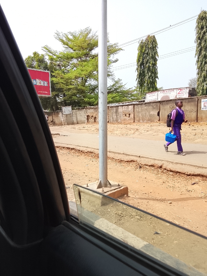 View from inside a car, capturing a street scene. A young boy in a purple uniform walks on the sidewalk, carrying a backpack and a blue lunchbox. In the background, a concrete wall lines the street, adorned with advertisements. Tall trees and power lines rise above the wall. A metal pole stands prominently on the sidewalk. The car window partially obscures the view.
