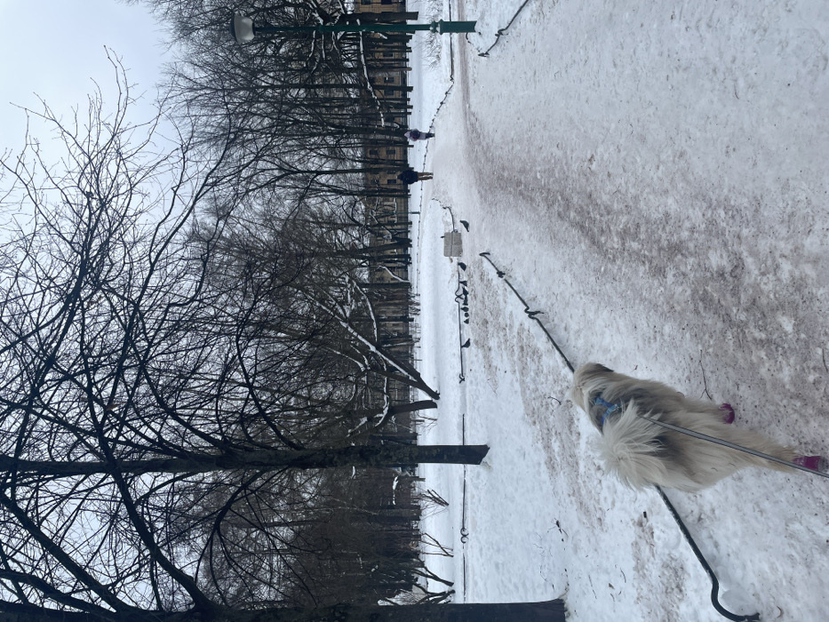 A winter scene is captured within a snow-covered park in Saint Petersburg, Russia, under an overcast sky. In the immediate foreground, the backside of a large, shaggy, light-colored dog (appears beige/white/grey) is visible, walking away from the camera on a leash. The dog wears a blue harness and pink booties on its rear paws. The path it traverses is partially cleared, exhibiting compacted snow, ice, and some visible grit. A low, dark metal fence parallels the path on its left side. Further along the path, to the left, approximately ten pigeons are scattered on the snow-covered ground. Two human figures are visible in the midground, walking away from the viewer along the same path; the leading figure is taller and appears to be an adult in dark attire, followed by a smaller figure, possibly a child, in lighter outerwear. A dark green lamppost with a classic design stands on the right side of the path. The park is characterized by numerous deciduous trees, bare of leaves, their branches lightly dusted with snow. In the distant background, multi-story, light-colored urban buildings are partially discernible through the tree line, marking the park's boundary. The overall environment indicates a cold, snowy winter day.