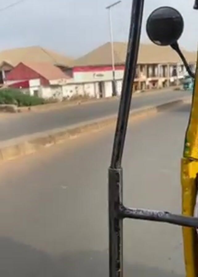 The view from inside a yellow motorized tricycle shows a road and the buildings across from it, including a large building with a light brown roof