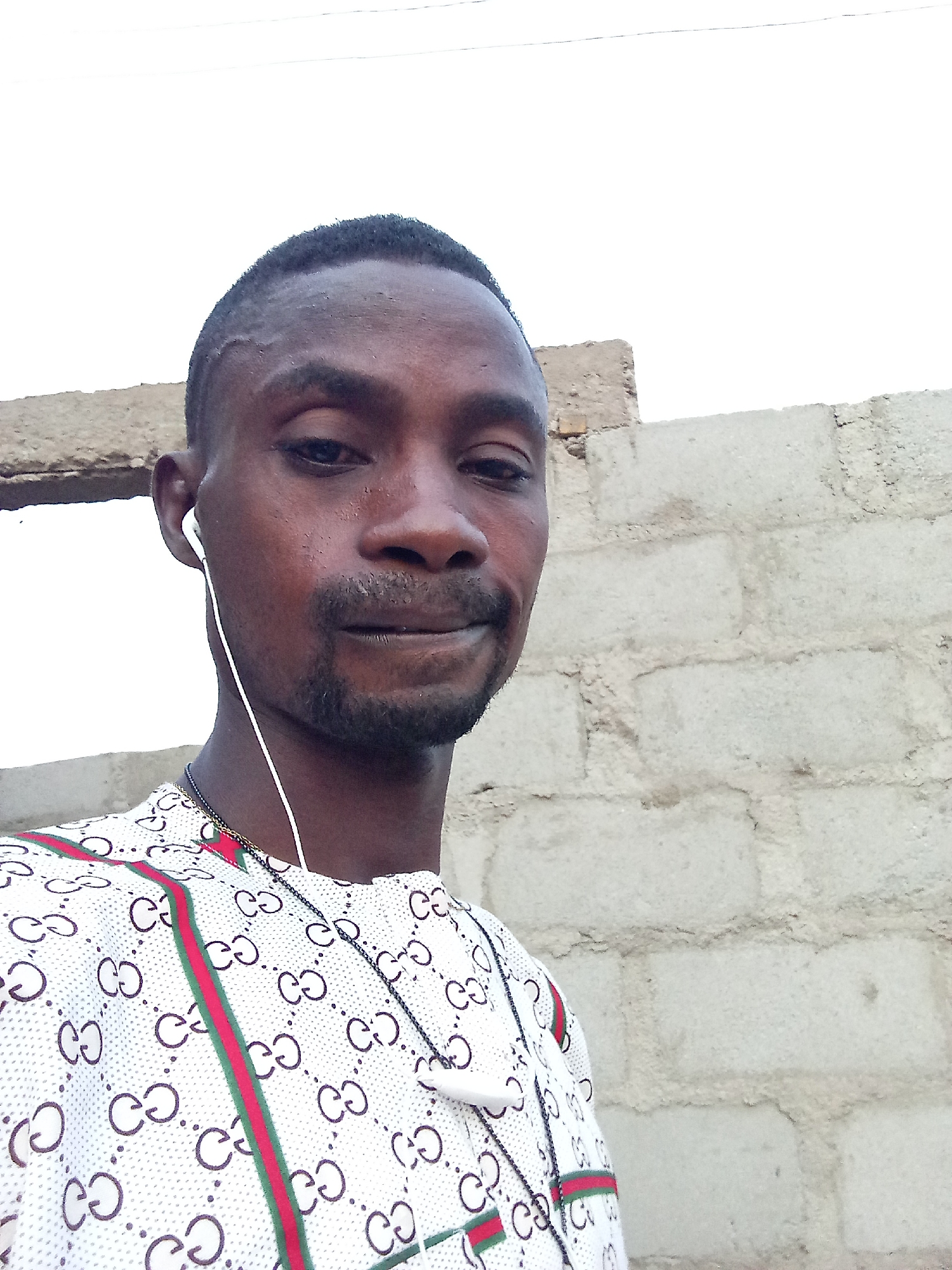 A medium shot depicts a man in Adonkolo, Nigeria. He has dark skin, short black hair, a goatee, and is wearing a white patterned shirt with green and red stripes. He is wearing earphones and a silver necklace. Behind him is a partially constructed brick wall. The sky is visible in the upper background.