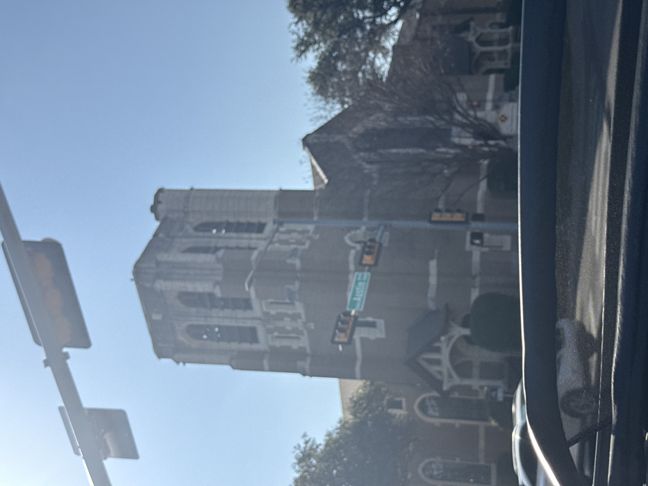 A low-angle shot shows a tall, grey, multi-story building with arched windows. A street sign reading "Austin" is visible on a pole. Traffic lights are also present on the same pole. Parts of the building have a darker roof line with trees obscuring some of the structure. The sky is bright blue. A partially visible car frame is on the right side of the image. Another traffic light structure is on the left side of the image.