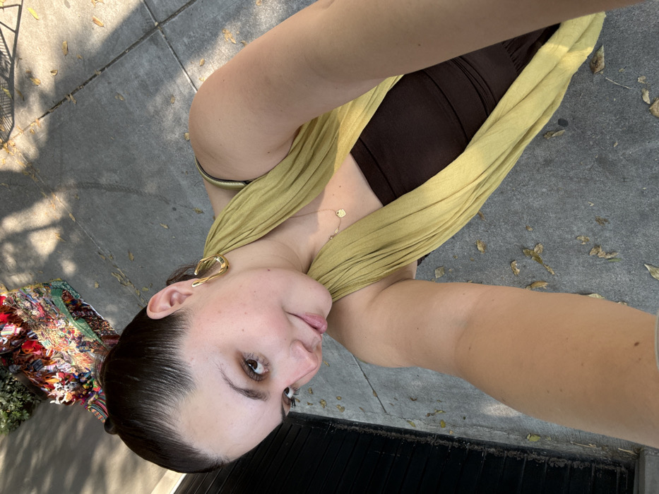 A selfie features a woman with fair skin, brown hair pulled back, and brown eyes. She's wearing statement gold earrings and a gold necklace. Her outfit consists of a brown top and a light yellow scarf draped around her neck. She also has a gold bangle on her wrist. The background includes a concrete sidewalk with scattered leaves, a glimpse of a colorful patterned item, and a dark, possibly metallic, structure. The lighting suggests an outdoor setting with natural sunlight.