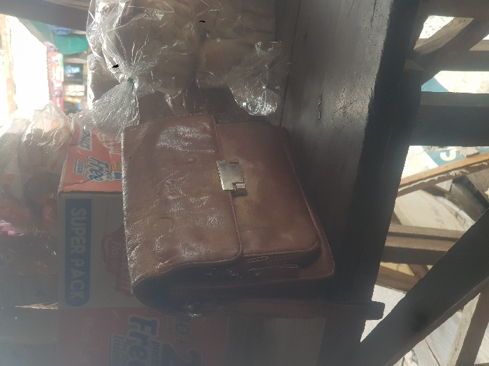 A brown leather shoulder bag rests on a dark wooden surface inside a market stall in Lokoja, Nigeria