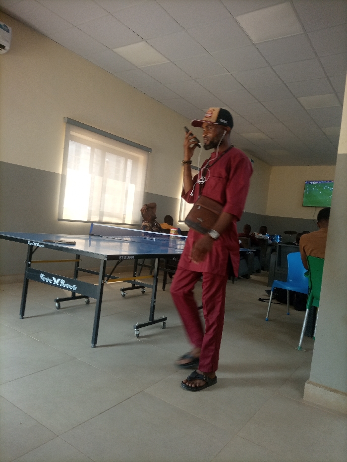 This image captures an indoor scene within the city of Opete, Nigeria, resembling a recreational area or common room