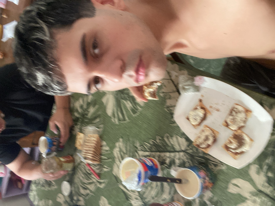 A shirtless person takes a selfie while eating. They are positioned above a table covered with a green patterned tablecloth. Visible on the table are a plate containing four toast squares with a topping, a stack of crackers, cups, and other unidentifiable food containers. A second person is partially visible on the left side of the frame, wearing a black shirt and holding a cup.