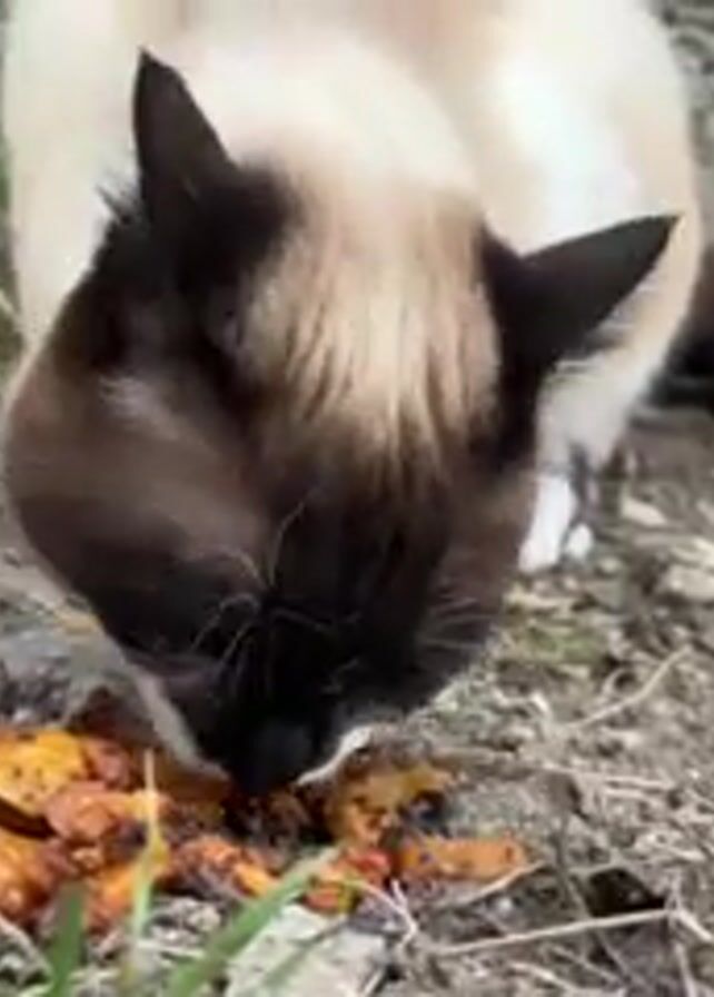 - "A brown and white cat with blue eyes eats a pile of cooked food off of bare earth" by FM-DTmnG3, licensed under CC BY 4.0
