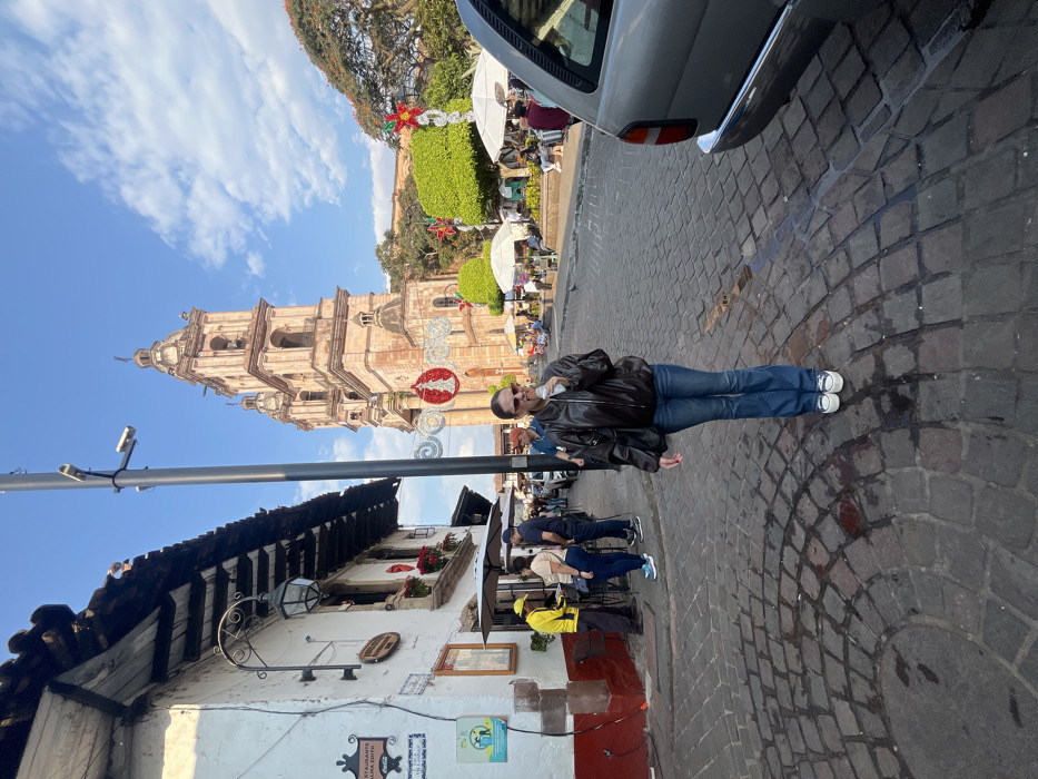 A street scene features a tall church tower with festive decorations in the background. A woman in a leather jacket and jeans stands on a cobblestone street. Buildings line the left side, including a restaurant with signage. People are gathered in the area beyond the woman, under umbrellas and trees. Part of a silver vehicle is visible in the upper right corner.