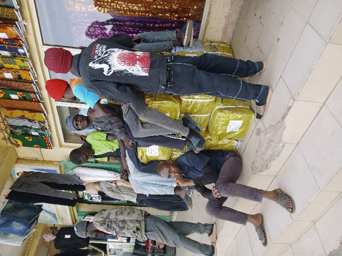 The image depicts an outdoor commercial area in Mumbwa, Zambia. Six males and multiple mannequins are present in front of a storefront. In the immediate foreground, one male sits on a light-colored tiled step, dressed in a dark blue short-sleeved shirt over a black long-sleeved shirt, dark brown trousers, and olive-green sandals, with his right hand resting near his chin. To his right, a stack of approximately twelve large, rectangular packages wrapped in shiny yellow material is arranged, serving as seating. Three males are seated on these packages: from left to right, one male in a light green short-sleeved shirt and light blue jeans; one male in a grey hooded sweatshirt and grey trousers, wearing black sandals; and one male in a light blue short-sleeved shirt and light grey trousers, wearing a red beanie, facing to the right. A fourth male stands with his back to the viewer, positioned to the right of the packages, wearing a black denim jacket with a white and red graphic on the back (partially visible text includes "WE LIVE & WORK... WITHOUT"), dark blue jeans, and dark sandals with socks, also wearing a red beanie. To the far left, a male in a camouflage-patterned hoodie and grey trousers is visible near multiple mannequins displaying dark trousers and shirts. The storefront behind them features a light-colored facade with windows that display colorful patterned fabrics. Various clothing items, including jeans, are hanging from a bar above the mannequins. The ground consists of light-colored tiles, with a damaged concrete step edge visible in the foreground.