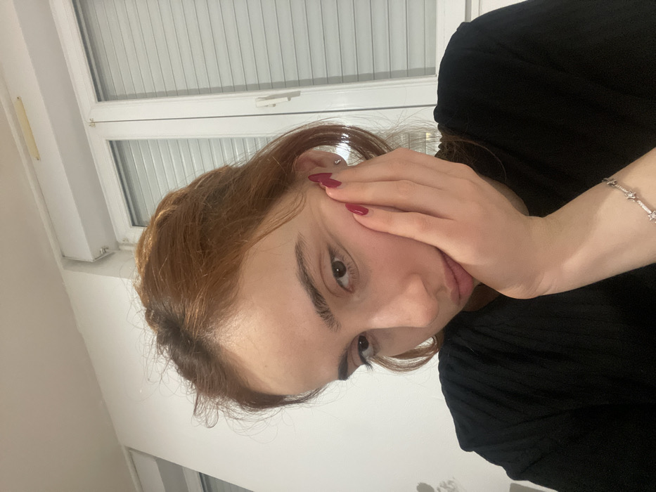 The image depicts a close-up indoor portrait of a young woman situated in Reims, France. The subject, with reddish-brown hair pulled back, possesses a fair complexion and dark eyebrows, with her brown eyes cast slightly downward. She wears a black, short-sleeved top with a visible ribbed texture. Her left hand is raised, with fingers resting against her left cheek and temple, supporting her head. Her fingernails are painted a deep red color. A silver-colored bracelet with small, reflective accents is worn on her left wrist, and a small silver stud earring is visible in her left earlobe. The background consists of a plain white wall on the left and a white-framed window on the right. Behind the window panes, a closed light-colored roller shutter is visible. The lighting is soft and ambient, suggesting an interior setting with natural light obscured or artificial illumination.