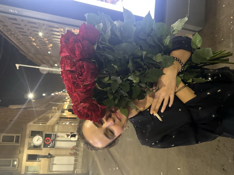 The image depicts a young woman standing on a city street at night in Milan, Italy, specifically on Corso Vittorio Emanuele II. The woman, positioned slightly left of center, is holding a large bouquet of red roses close to her face and chest, with her eyes closed in a serene or pleased expression. She is wearing a dark, long-sleeved collared shirt with a pattern of small white stars. A lit cigarette is held between the index and middle fingers of her left hand. She wears a delicate necklace and a dark beaded bracelet on her right wrist. The background shows a well-lit street lined with multi-story, historically styled buildings. On the left, a prominent building features a large, round white clock face with dark markings. Below the clock, a red circular sign with a white diagonal bar (indicating "No Entry" or "Do Not Enter") is visible, and beneath that, a rectangular sign begins with "VIA". Streetlights illuminate the scene, and a bright, vertical light panel is visible on the right side of the frame. The street surface appears to be paved, with faint lines that may indicate tram tracks. A blurred figure in a white hoodie is visible further down the street on the left, near some bicycle racks. The overall environment suggests a bustling urban commercial area at night.