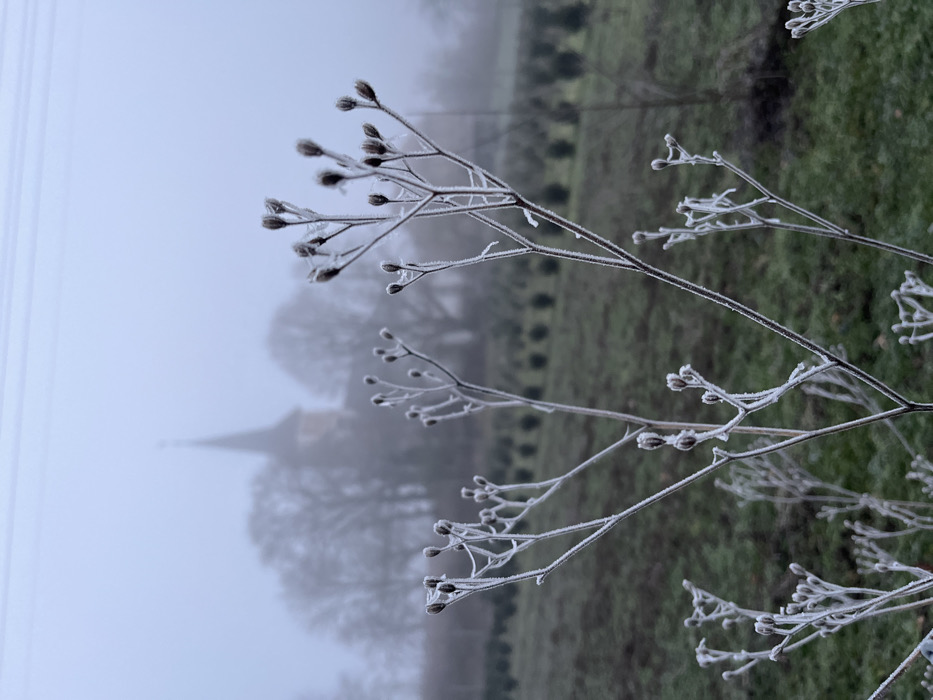 The image features frosted plant stems in the foreground. Small buds or seed heads are covered in frost. A soft, green background suggests a field. In the hazy distance, a building spire is barely visible, adding depth and a sense of mystery. The lighting is subdued, creating a cool, tranquil atmosphere.