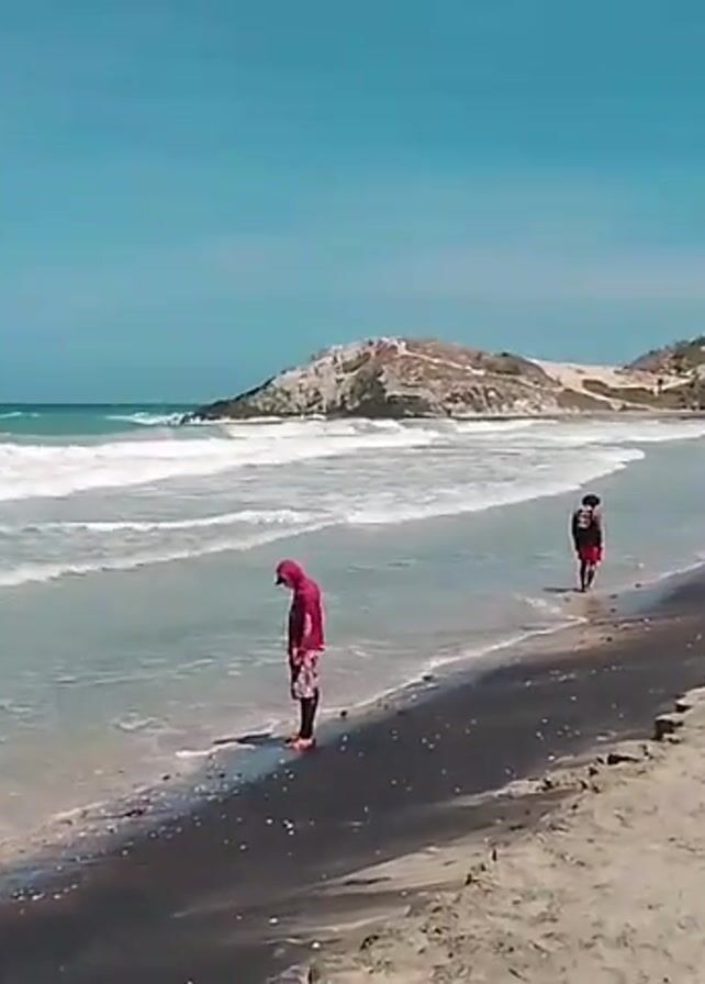 The scene shows a beach with a dark strip of sand along the water's edge, contrasting with the lighter sand further up the beach. Two individuals are visible: one stands at the water's edge in a red hooded shirt and dark shorts, looking down at the water, while the other walks further down the beach in a black shirt and red shorts. The ocean has moderate waves breaking along the shore. In the background, there's a hill or small mountain, and palm trees are scattered along the edge of the beach. Several white lounge chairs are neatly arranged on the sand near a structure with glass windows, possibly a beachside bar or restaurant. The sky is clear and blue.