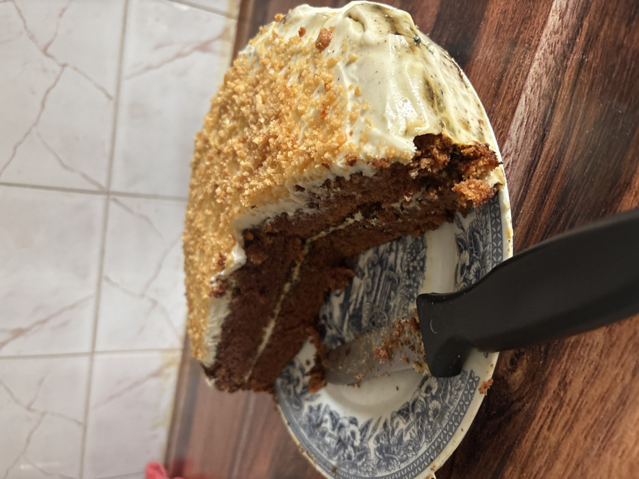 - "A partially consumed, multi-layered round cake is depicted on a patterned ceramic plate within a domestic kitchen environment located in Stefan Karadja, Bulgaria" by FM-kr1G73, licensed under CC BY 4.0
