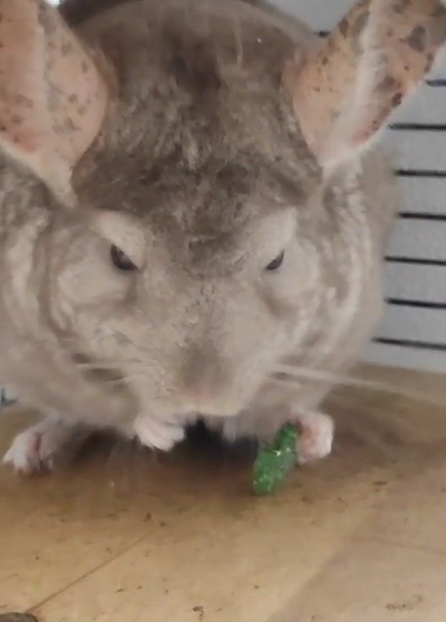 A close-up shows a chinchilla sitting on a wooden surface inside a wire cage. The chinchilla has gray fur and is holding a green object in its paws, which it appears to be eating. Its ears are large with dark spots, and its whiskers are prominent. The background consists of the inside of the cage, with a white wall and a wire mesh visible.