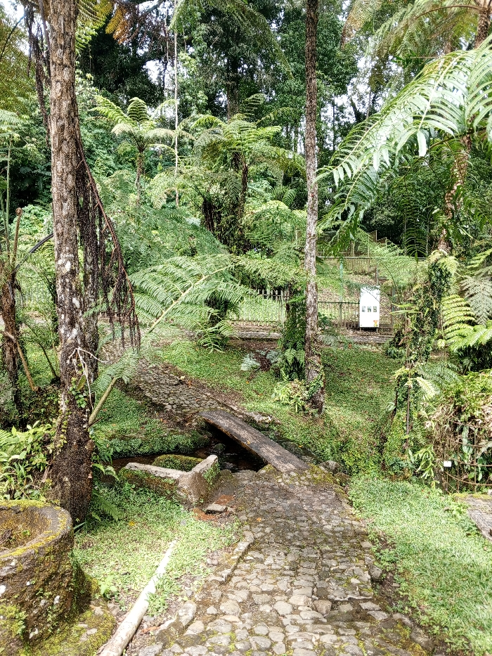 The image depicts a lush, heavily vegetated outdoor environment, identified as a natural park or botanical garden within Đà Nẵng, Vietnam. No individuals are present in the scene. In the foreground, an irregularly shaped cobblestone path, showing signs of dampness and moss growth, extends from the bottom center, gradually ascending and curving to the left. To the immediate left of the path, a moss-covered cylindrical stone basin is visible. A shallow stream with dark water traverses the scene perpendicularly to the path. A single, weathered wooden plank serves as a rudimentary bridge over this stream, positioned diagonally. Adjacent to the plank, a moss-covered concrete trough-like structure is partially submerged in the stream. The midground is dominated by a dense array of tropical flora, including several tall trees with mottled, light-colored bark and numerous large ferns, some identified as tree ferns, forming a layered canopy. On the right side, beyond the stream, a light-colored, rectangular utility cabinet, possibly electrical, stands on a grassy incline. Behind this cabinet, a series of outdoor steps with railings, constructed from wood or concrete, ascends steeply into the dense foliage. A light-colored metal fence runs horizontally behind the utility cabinet and along the base of the ascending stairs. The background consists of a dense, multi-layered canopy of trees and ferns, creating an immersive green environment. Patches of an overcast or diffused sky are visible through gaps in the upper foliage. The overall lighting is soft, suggesting a cloudy day or a deeply shaded area within a humid, verdant landscape.