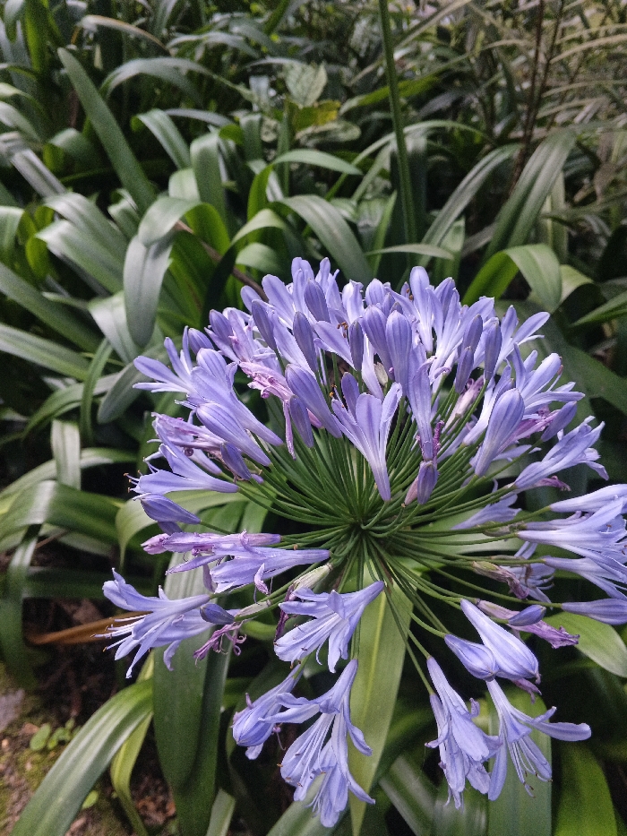 The scene is observed in Stueng Saen, Cambodia. The primary subject is a dense, spherical inflorescence composed of numerous light purple to lavender tubular florets, consistent with an Agapanthus plant, positioned centrally in the frame. Individual florets exhibit varying stages of bloom, some fully open with visible stamens, while others appear partially closed or slightly withered at the tips. The central stalk structure supporting the florets is green and radiates outwards. The background consists of out-of-focus, lush green foliage with broad, elongated leaves, creating a natural, verdant backdrop. No individuals, actions, interactions, or human-made objects are present within the frame.