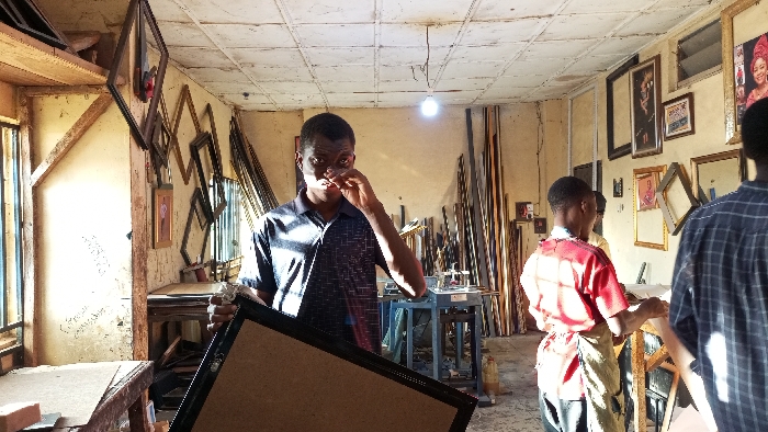 Inside a busy frame shop, a man in a patterned shirt stands in the foreground holding a large frame. Behind him, another man in a red shirt works at a table, wearing an apron. A third person in a plaid shirt is partially visible on the right. The shop is filled with picture frames of various sizes and styles, hanging on the walls and leaning against them. A light bulb hangs from the ceiling, illuminating the scene.