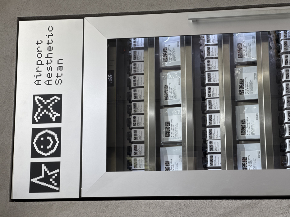 - "A vertical, silver-framed vending machine or display cooler, identified as "Airport Aesthetic Stan" by pixelated text and accompanying pixelated icons (a star, a smiling face, and a propeller-like symbol) on its upper signage, is depicted against a textured, light gray wall" by FM-IdNfF2, licensed under CC BY 4.0
